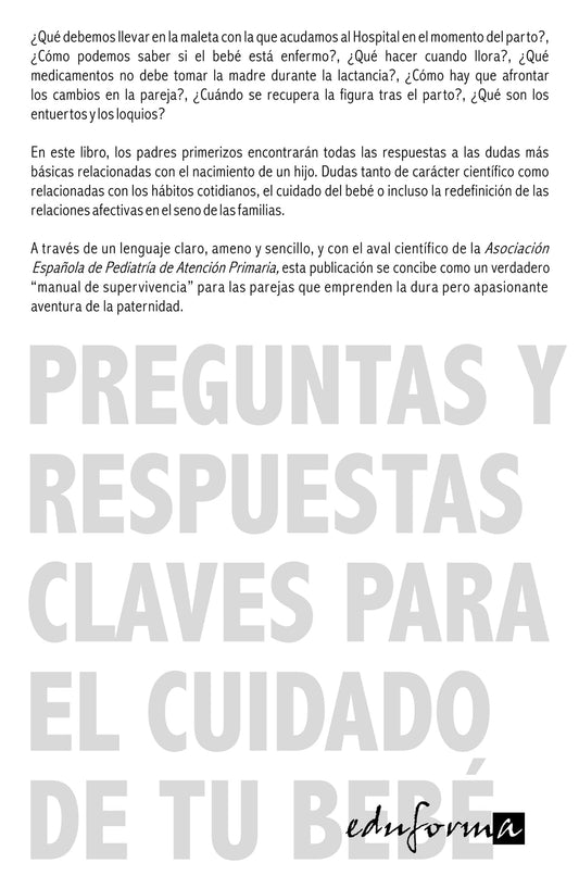 Precio habitual €8,04 EURPrecio habitualPrecio unitario / por€8,00 EURPrecio de oferta €8,04 EURAutor: VV.AA.Marca: Editorial MADNúmero de páginas: 182Fecha de lanzamiento: 02-04-2009Detalles: ¿Qué debemos llevar en la maleta con la que acudamos al Hospital en el momento del parto?, ¿Cómo podemos saber si el bebé está enfermo?, ¿Qué hacer cuando llora?, ¿Qué medicamentos no debe tomar la madre durante la lactancia?, ¿Cómo hay que afrontar los cambios en la pareja?, ¿Cuándo se recupera la figura tras el...
